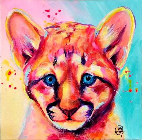 Despite its potential for strength and leadership, the cub is also incredibly cute, with its soft, fluffy fur and big, expressive eyes i wanted to capture the cuddly aspect of the cougar, making it impossible not to be drawn in by the cub's adorable presence. The painting is a charming and joyful representation of the cougar cub, showcasing both its leadership potential and its adorable, playful nature.