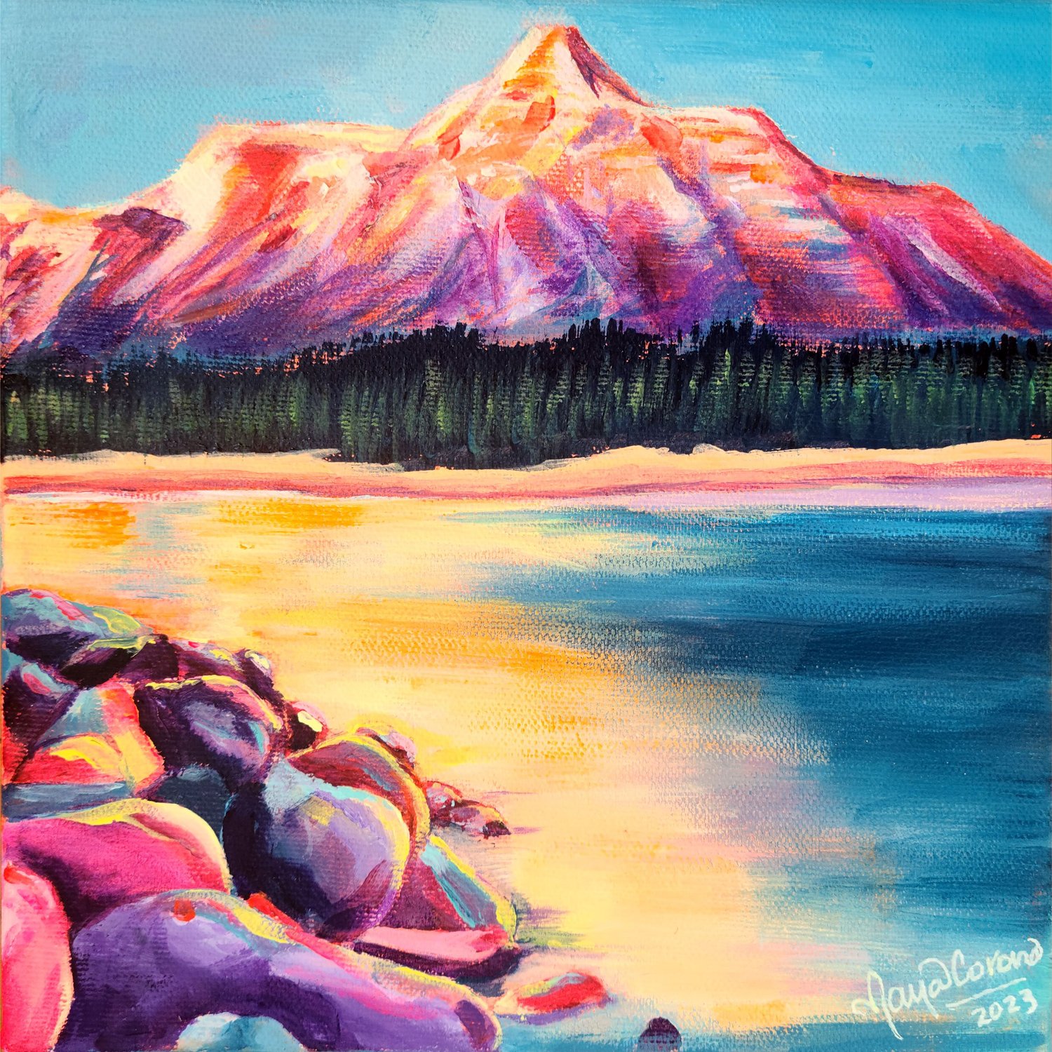 Transform your space with this beautiful Landscape Acrylic painting on a Gallery-Wrapped Canvas. Measuring 8x8 inches, the painting of the Rocky Mountains, titled "Fresh Breath," is the perfect size for adding a pop of colour and interest to any small wall area. The warm hues and stunning scenery create a cozy and inviting atmosphere that infuses your room with peace and calmness. Bring a touch of warmth and beauty to your space with this original piece of art featuring the breathtaking Rocky Mountains.