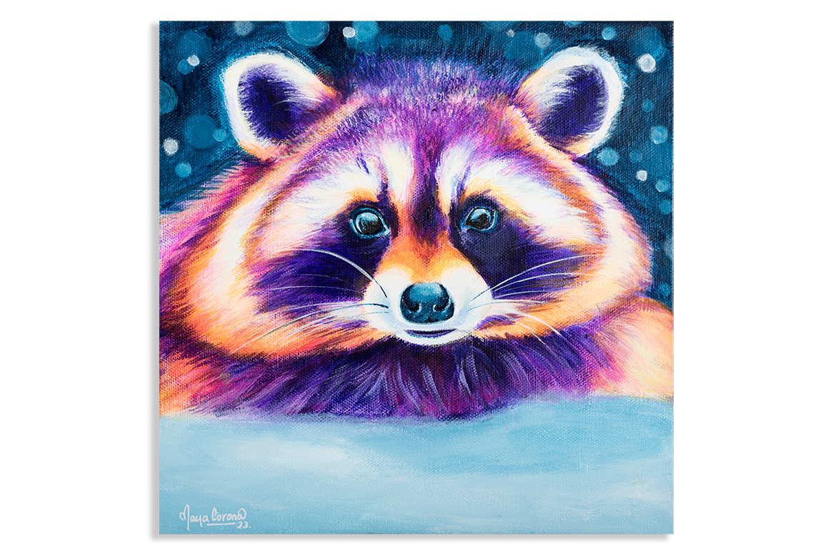 Discover the enchanting world of "Haroon the Raccoon," a captivating 10x10 inch acrylic artwork on canvas by Maya Corona.