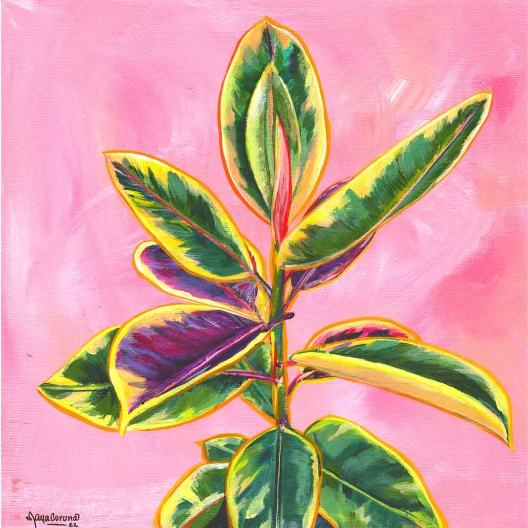 A 12x12 inch acrylic on canvas painting of a Ruby Rubber tree, also known as a Ficus Elastica Ruby. As an artist who loves painting plants and foliage, I was inspired to create this piece that symbolizes abundance, happiness, and wealth. I added my own unique touches of colour to make this painting truly special and one-of-a-kind.